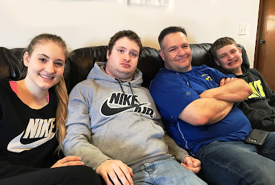 Sunday morning we decided to stay home from church with Brandon. Scott and Brandon laid on our bed for a long time listening to music. He was so calm and happy...I know Scott really enjoyed it! We then had a nice dinner at Mom and Dad's house and celebrated Valeda and Scott's birthdays. Mom made a beef roast and I made Scott's favorite Texas Sheet Cake. Everything was so yummy! We played 5 Crowns and enjoyed soaking in the warm sunshine outside...it was so nice! I was happy to get a few pictures with Brandon smiling. Then the five us went together to take Brandon back to his home. Love weekends like this...just perfect!