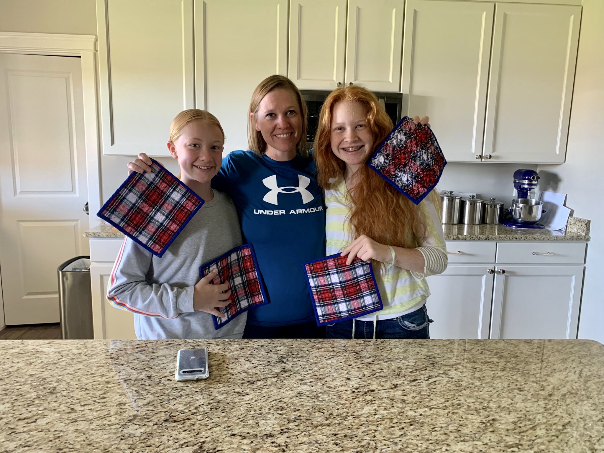 Teniele went on a trip to Las Vegas with some friends. She took gifts that mom made for Reid's family. She said she had a blast. Sadie wanted to start a garden this year so mom made the cute gardening bags for her and Chad. She made the hot pads from one of dad's shirts.