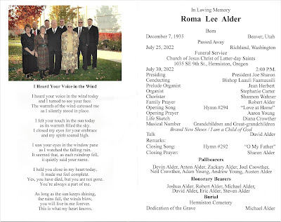 Roma enjoyed life. She loved being around her children and grandchildren. She made birthdays and holidays fun and memorable. She even made getting new shoes special and would sing to us and our children the 'Brand New Shoes' song every time. She had a great sense of humor and we spent lots of time laughing and playing together. She loved playing games, telling stories and found lots of ways to share her testimony of the gospel of Jesus Christ.
